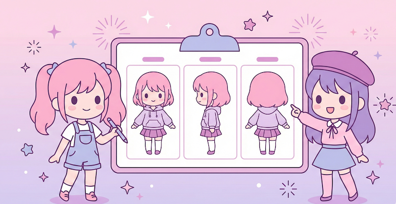 A character design sheet (also called character reference sheet or model sheet) is a visual document that shows a character from multiple angles, typically including front, side, and back views, along with expression variations and sometimes pose references. It's essential for animation, game development, and illustration projects.
